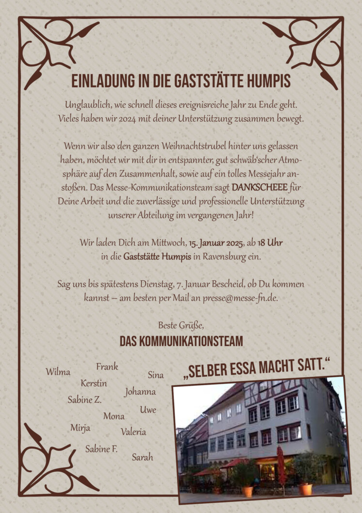 Wenn wir also den ganzen Weihnachtstrubel hinter uns gelassen haben, möchtet wir mit dir in entspannter, gut schwäb‘scher Atmosphäre auf den Zusammenhalt, sowie auf ein tolles Messejahr anstoßen. Das Messe-Kommunikationsteam sagt DANKSCHEEE für Deine Arbeit und die zuverlässige und professionelle Unterstützung unserer Abteilung im vergangenen Jahr!